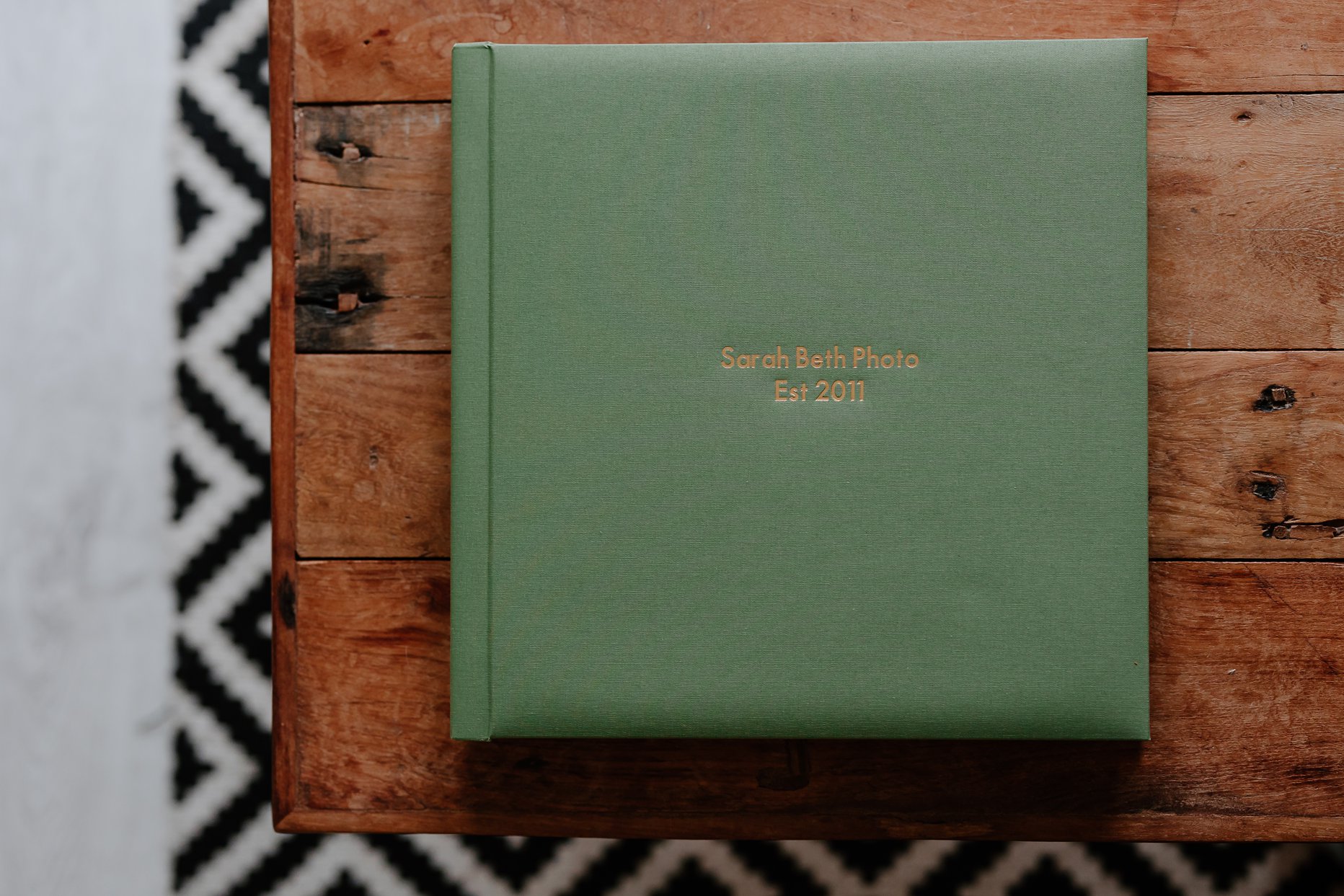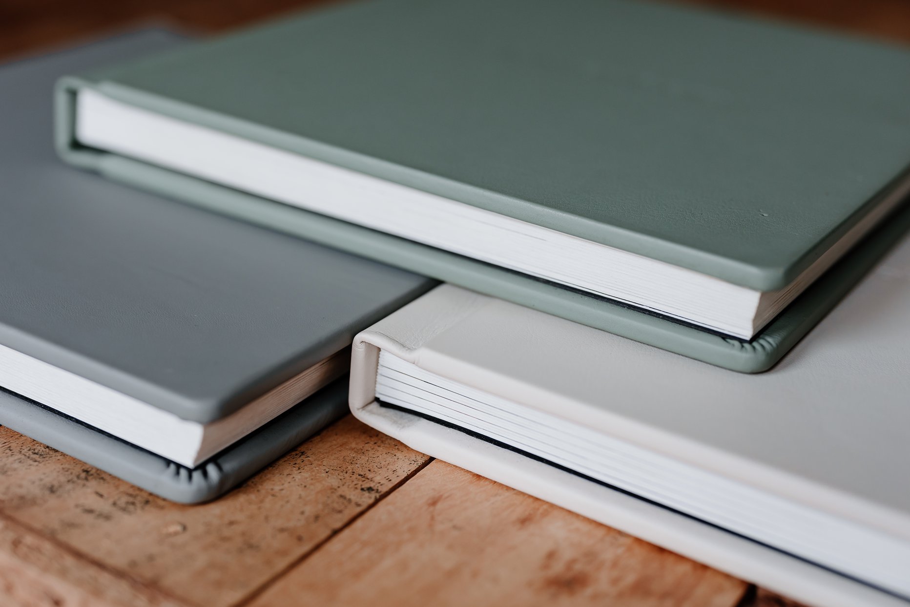 Pictured are sage, duck egg and ivory leather bound fine art albums.